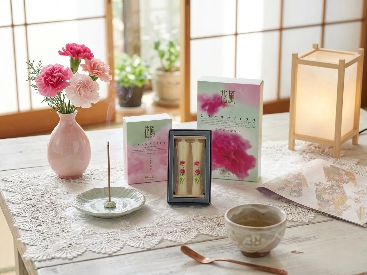 「カーネーションのお線香」や「手描きのカーネーション絵ろうそく」など、お母様への「ありがとう」を形にできるアイテムが人気です。